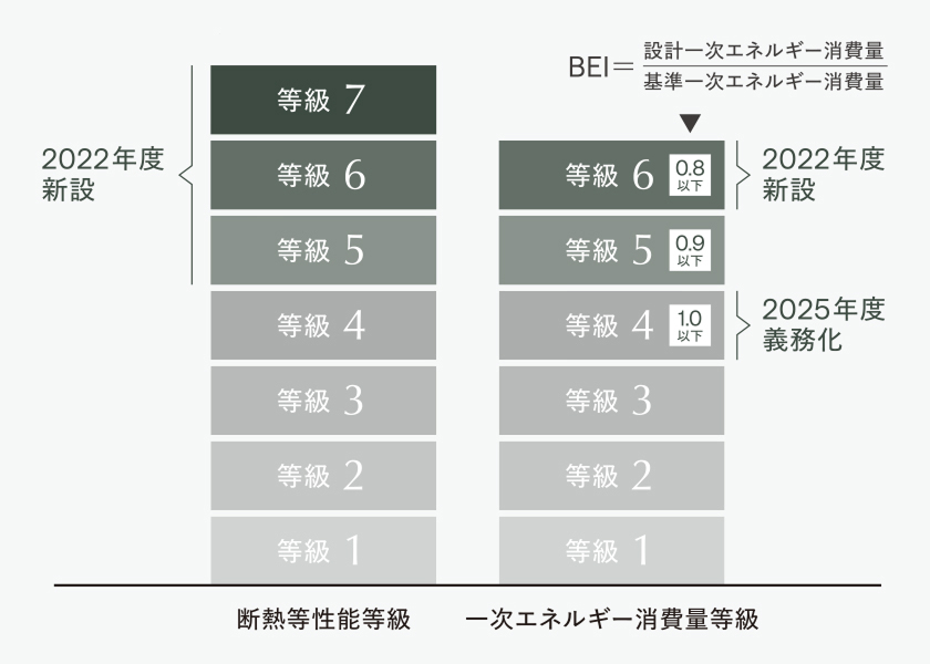 2030年の省エネ基準改正を見据えた断熱仕様を採用。断熱等性能等級5、一次エネルギー消費量等級6(ZEH相当)を満たしています。外気の影響を受けにくく、冬暖・夏涼の快適性とランニングコスト・CO2の削減を両立。