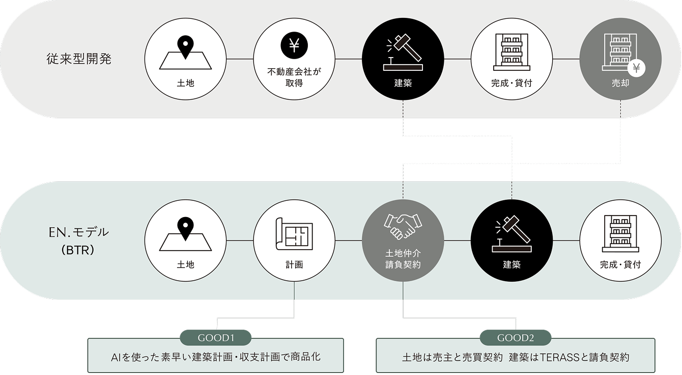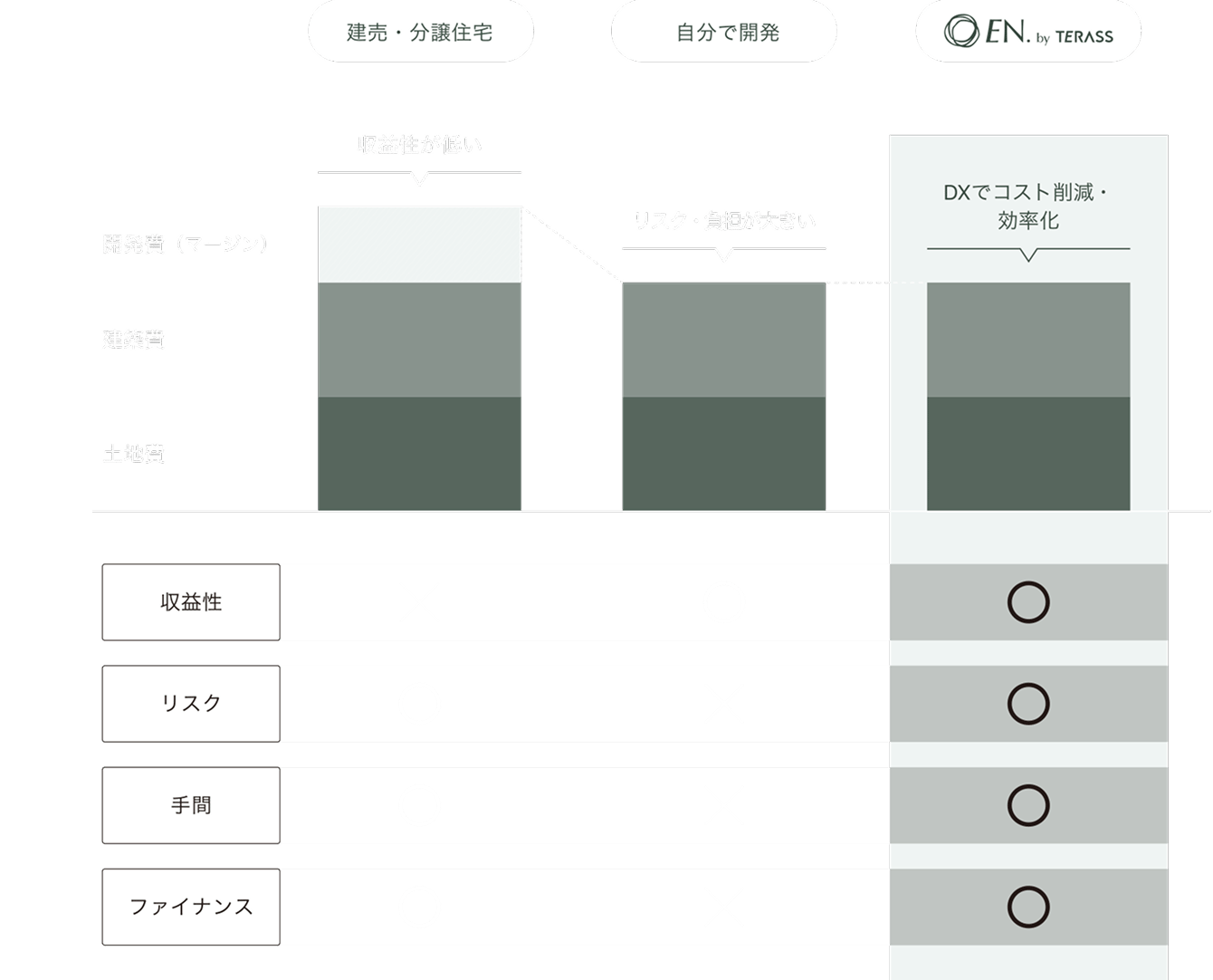 EN. by TERASSは受注生産×標準設計×一括PMで手戻りと中間コストを圧縮。用地取得→設計→建築→運用、ファイナンスサポートまでTERASSが担い、収益性は高く、リスクと手間は低く抑えます。